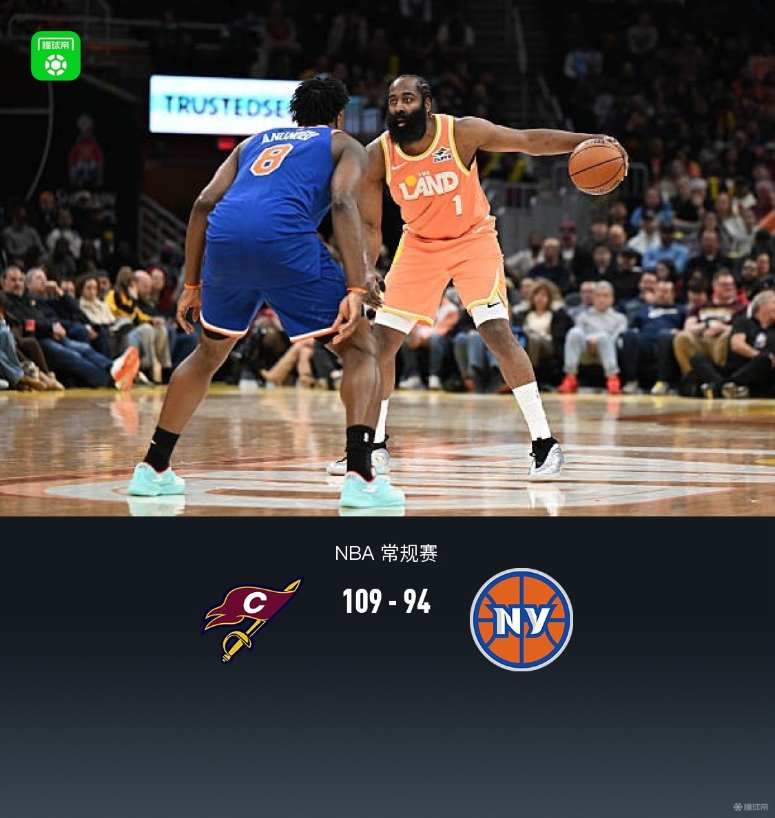 第四节骑士米切尔拿下6分,尼克斯布伦森拿下6分,最终骑士109-94战胜尼克斯