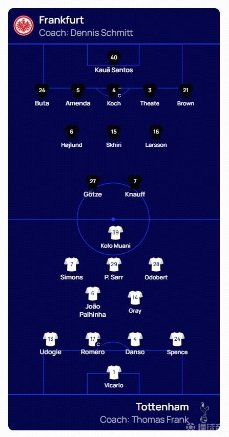 法兰克福首发:40-考阿-桑托斯、5-阿门达、4-科赫、3-阿蒂尔-蒂特、24-布塔、6-奥斯卡-霍伊伦、16-胡戈-拉松、21-纳撒尼尔-布朗、15-斯希里、27-格策、7-克瑙夫