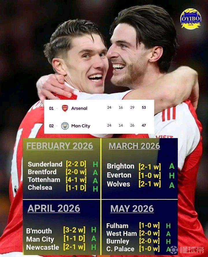 稳了,真的稳了!英超38轮赛程已进行至第24周,阿森纳目前以53分继续领跑积分榜,剩余14场比赛待进行。在与此前剩余14个对手的首回合交锋中,阿森纳取得了11胜2平的战绩,从可能的39分中拿下35分。目前剩余赛程中主客场分布均衡,各占7场比赛。结合首回合对阵的优异表现与球队当前稳居榜首的态势来看,争冠前景极为乐观。历史交手数据显示,阿森纳在应对剩余对手时处于明显优势地位,这意味着球队在最后14轮比赛中极有可能收获大部分积分。尤其值得关注的是三月与五月的赛程——在首回合比赛中,阿森纳保持全胜战绩。而四月将面临最严峻考验,其中与曼城的对决将是最大挑战,此外二月也有一两场硬仗。若能顺利度过二月和四月,并保持至少3分的领先优势,冠军归属实际上就已决定。届时最终月份的比赛将成为以显著优势锁定冠军的加冕仪式。阿森纳正朝着英超冠军稳步前进。