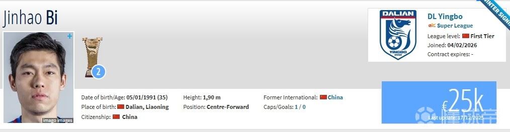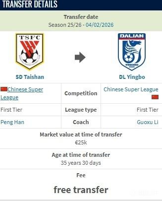 北京时间2月4日,德转更新,原山东泰山球员毕津浩正式加盟大连英博。