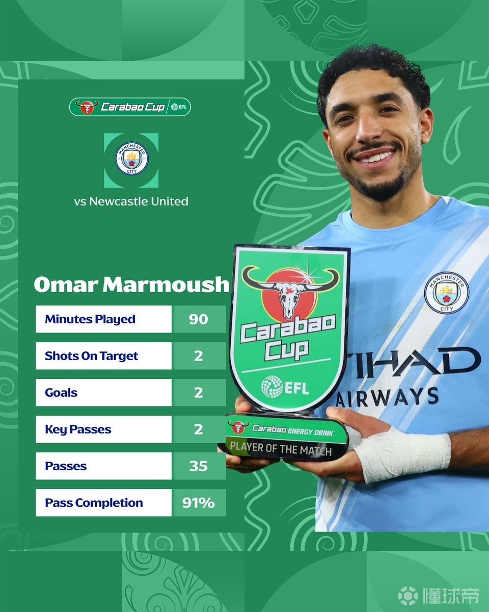 此役主场对阵纽卡斯尔联,首发出战的马尔穆什在上半场上演梅开二度,帮助曼城3-1击败对手,以总比分5-1闯进英联杯决赛。