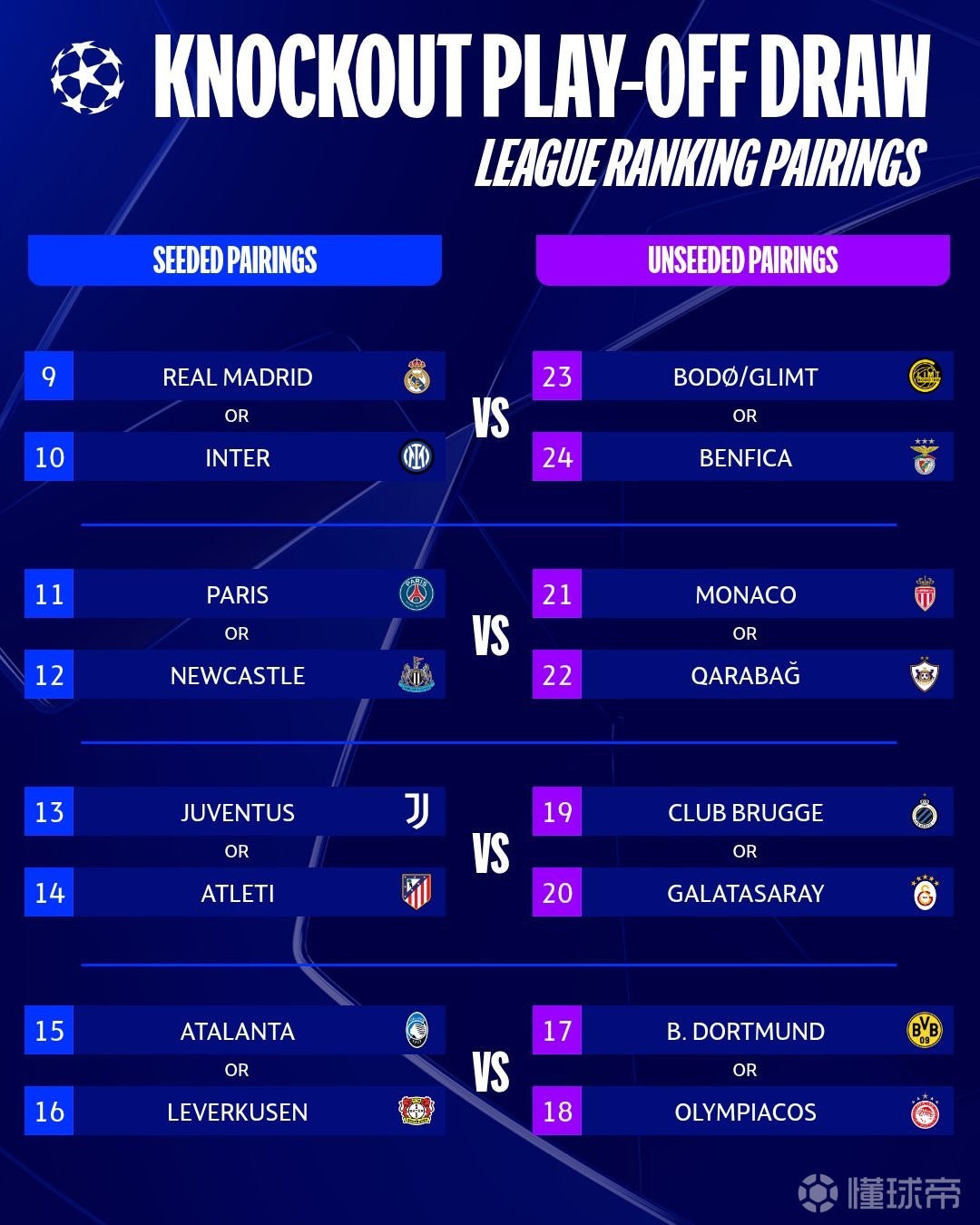 本赛季落入淘汰赛附加赛的五大联赛球队共有10支,包括皇马、马竞、大巴黎、多特、勒沃库森、国米、尤文、亚特兰大、纽卡和摩纳哥。