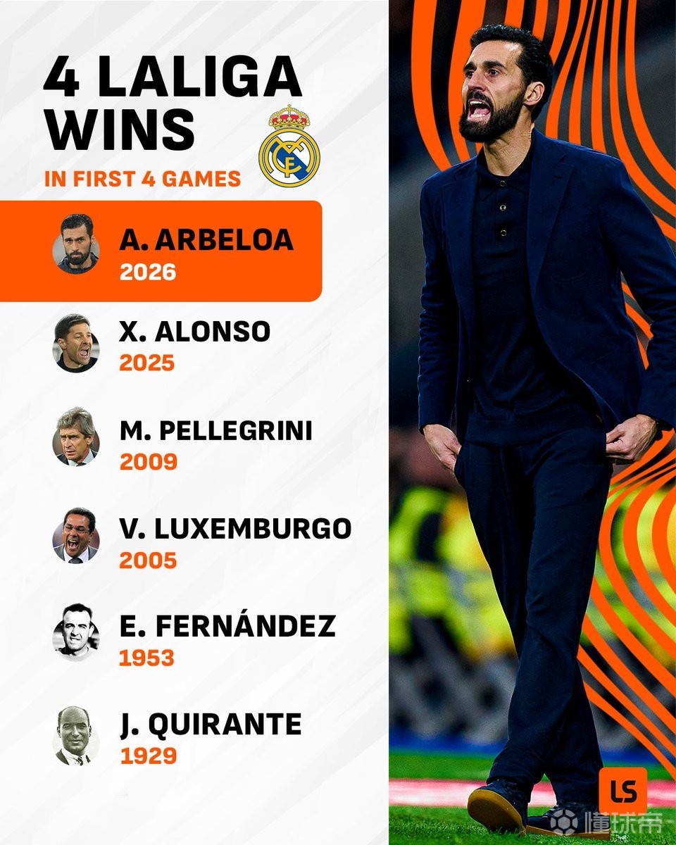 执教皇马前四场西甲全胜,阿韦洛亚成队史第六人
