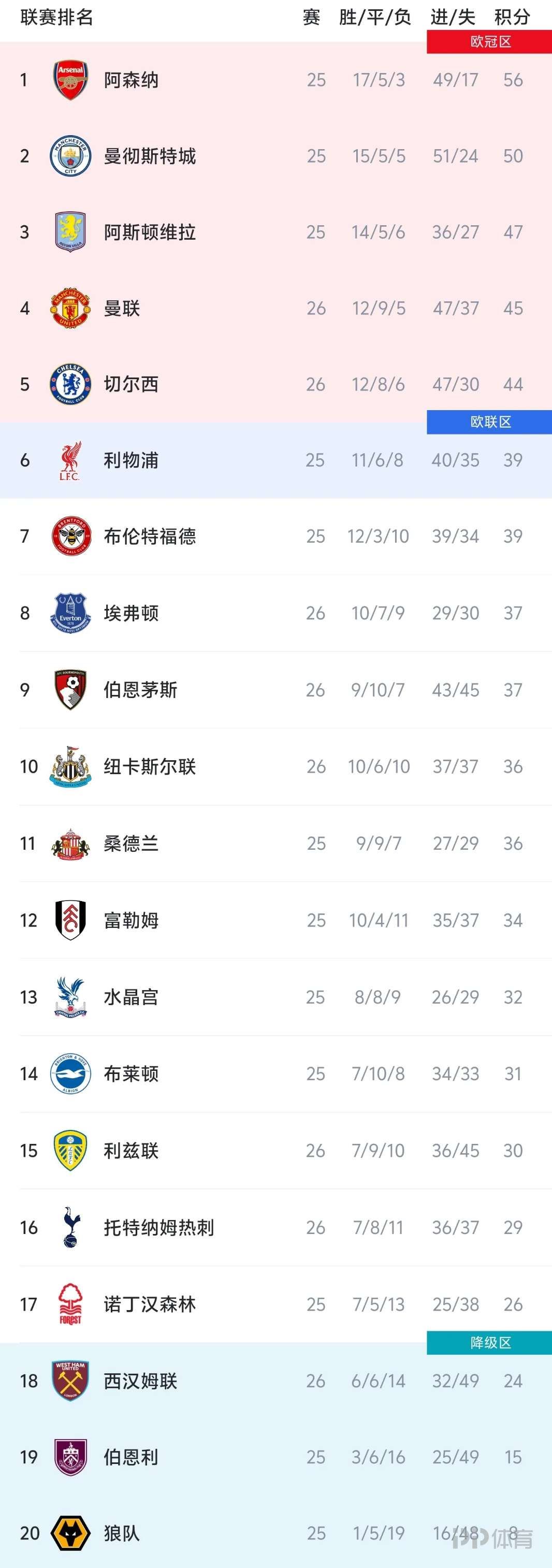英超积分榜:曼联第4切尔西第5 热刺输球跌至第16名