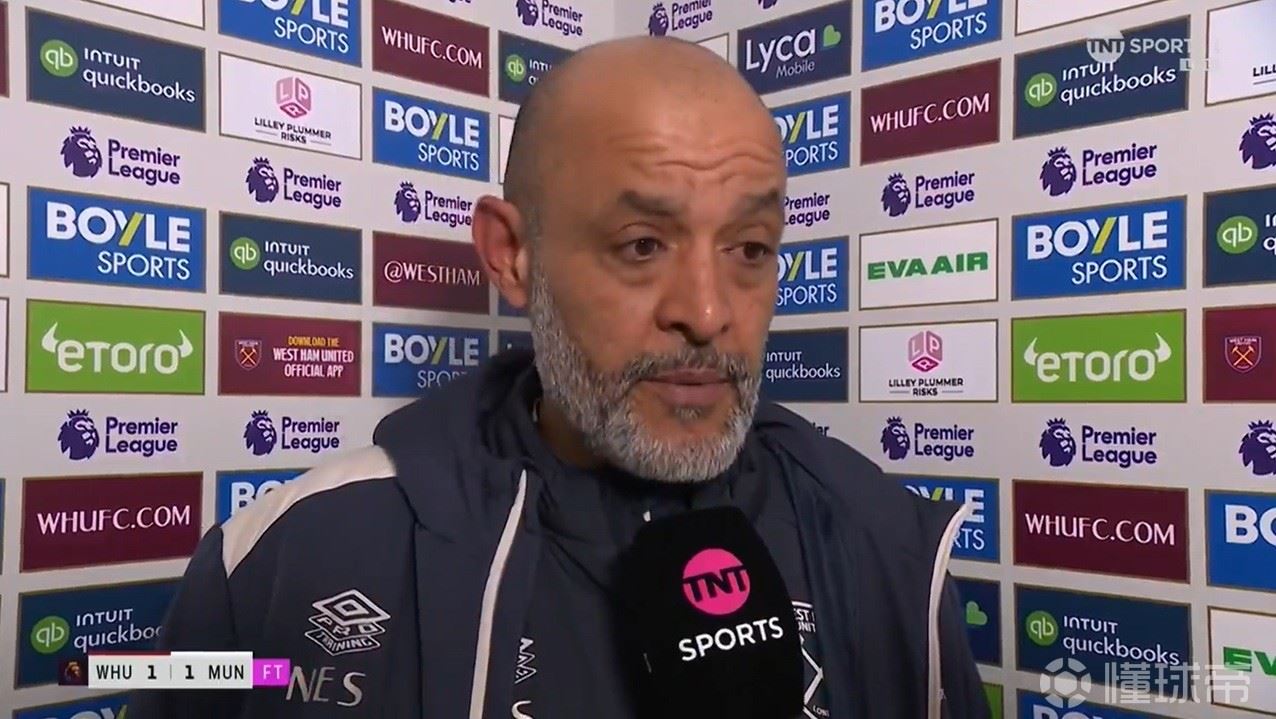 英超第26轮一场较量,西汉姆联主场被曼联绝平。赛后,铁锤帮主帅努诺接受了TNT体育的采访。