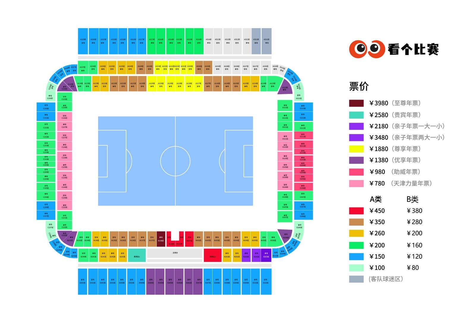 8.本赛季联赛最后两个主场将在天津奥体中心体育场(水滴体育场)进行,票区图届时在单场票发售公告中发布。