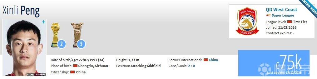 北京时间2月11日,德转更新,彭欣力、刘小龙加盟西海岸。