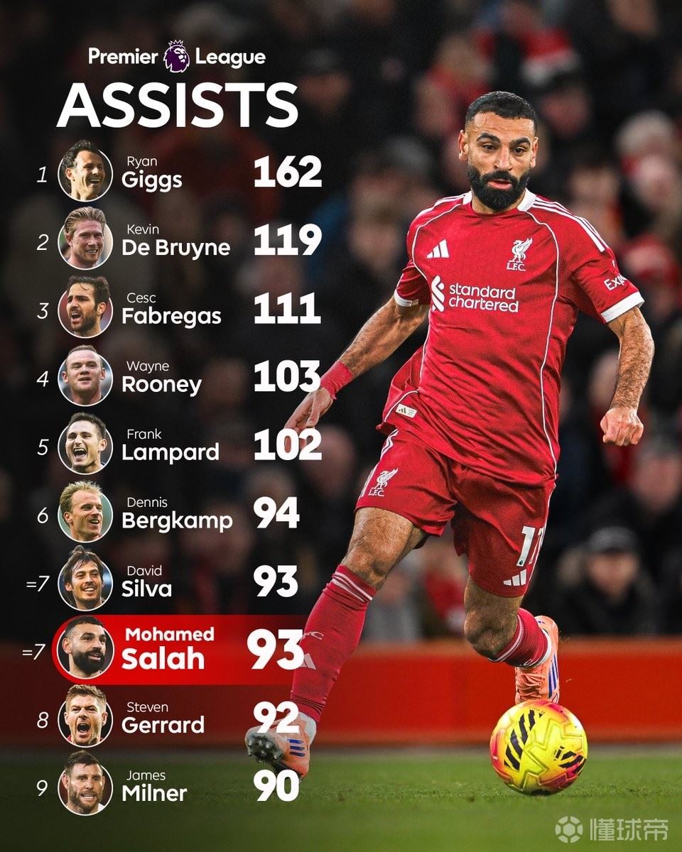 93次超越杰拉德、追平D席,萨拉赫升至英超历史助攻榜第六位