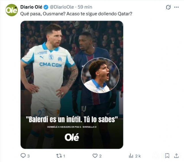在巴黎圣日耳曼5-0大胜马赛的比赛中,登贝莱针对巴列尔迪的调侃言论引发阿根廷媒体强烈反应。相关画面在阿根廷广泛传播,多家媒体为巴列尔迪发声,并提及登贝莱在世界杯决赛中的表现。