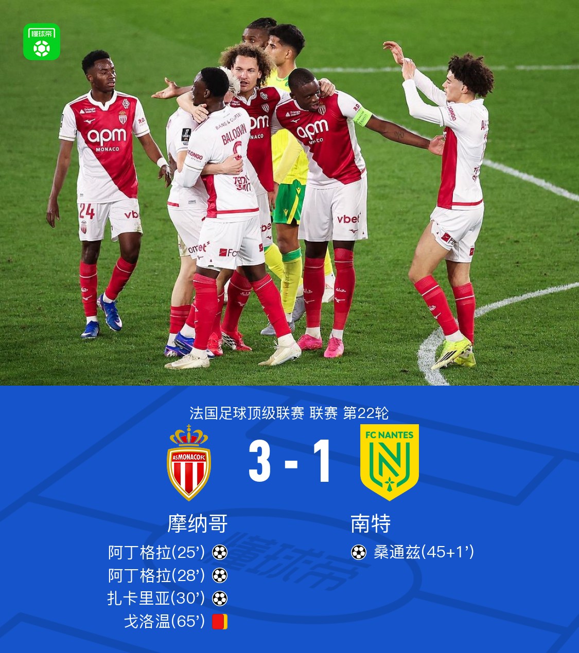 十人摩纳哥3-1南特,阿丁格拉双响,扎卡里亚破门,戈洛温染红