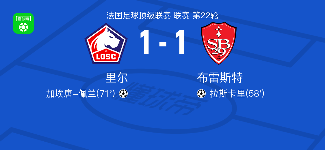 北京时间2月15日法国足球顶级联赛 联赛 第22轮,里尔主场对阵布雷斯特。里尔加埃唐-佩兰破门。布雷斯特拉斯卡里破门。最终比分里尔 1-1 布雷斯特。