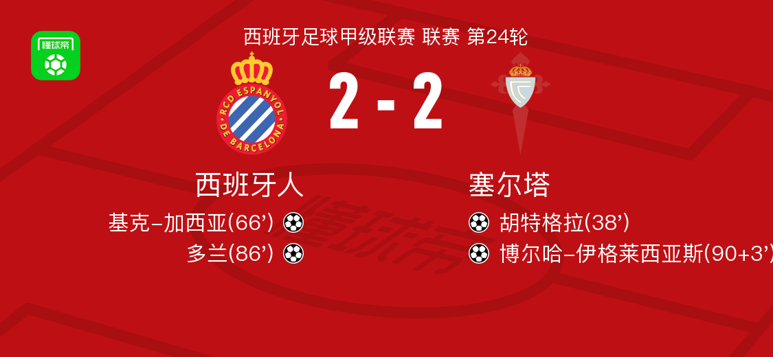 北京时间2月14日西班牙足球甲级联赛 联赛 第24轮,西班牙人主场对阵塞尔塔。西班牙人基克-加西亚破门,多兰破门。塞尔塔胡特格拉破门,博尔哈-伊格莱西亚斯破门。最终比分西班牙人 2-2 塞尔塔。