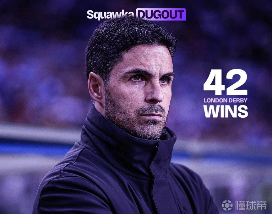 阿尔特塔英超伦敦德比取胜42场,追平穆里尼奥仅次于温格