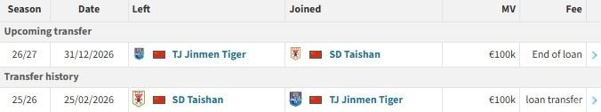 北京时间2月25日,德转更新,山东泰山后卫吴兴涵租借加盟天津津门虎。